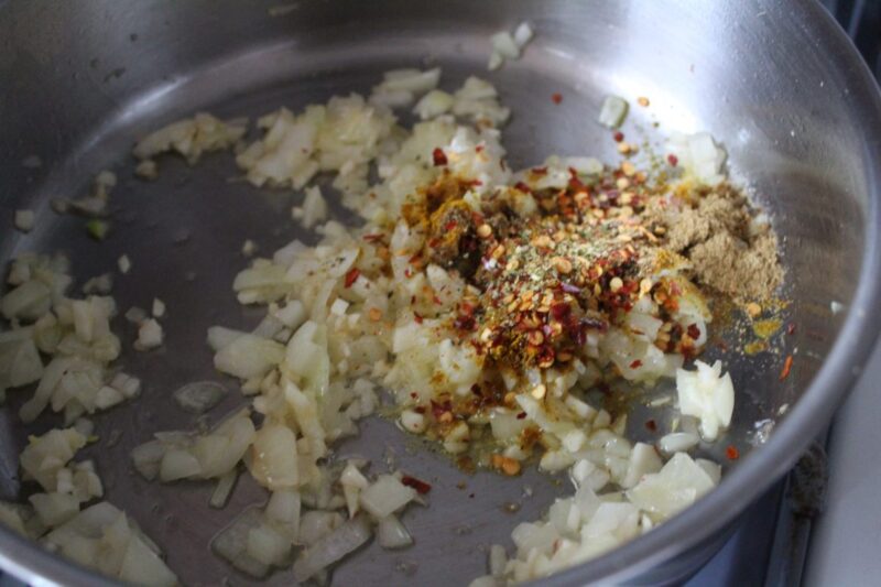 - Heat a pot to medium-high and add coconut oil, chopped onion, garlic, ginger and cook until translucent (about 2 to 5 minutes). Add all dried spices to the pot and stir to combine for another minute. Add chopped tomatoes with water and lower heat to a low bubble and cover for 8 to 10 minutes.